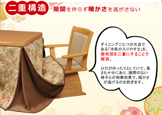 | ■材質 | ●ダイニングコタツテーブル 天板…天然木突板 本体…天然木ラバーウッド 塗装…UV塗装 ●ローチェアー 本体…天然木ラバーウッド 塗装…アミノ塗装 貼地…合成皮革 ●掛け布団 表地…綿100% 裏地…ポリエステル100% 中綿…ポリエステル100%(100g/uアルミシート入り) |